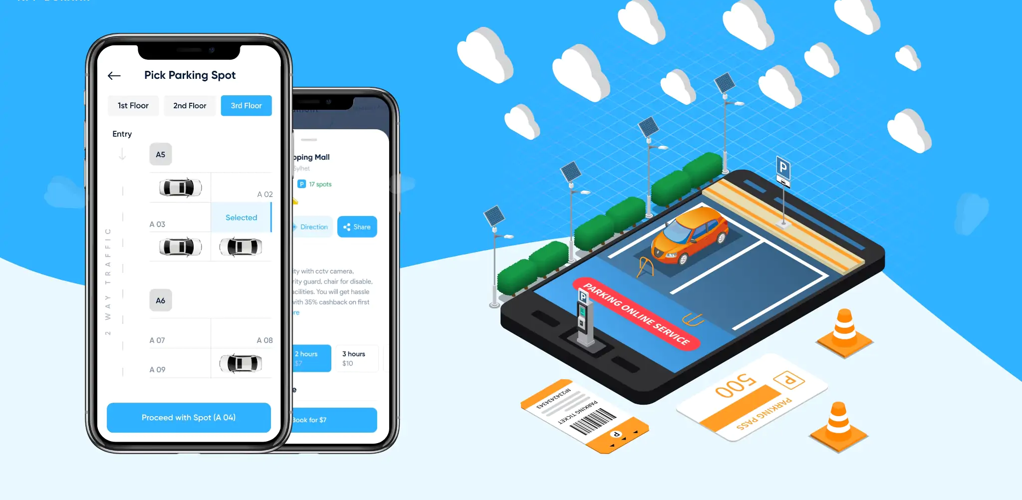 The project uses cameras and image processing to monitor parking spaces in real-time and displays availability to drivers via a smartphone app, reducing search time and congestion.